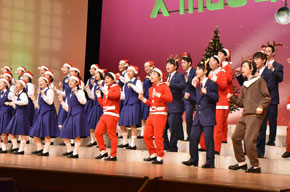 親子のためのクリスマスコンサート  町内の保育園、幼稚園年長児約170名との共演ステージもあり、『あわてんぼうのサンタクロース』『小さな世界』を歌いました。緊張しながらも、元気いっぱいに歌う園児の姿に会場全体がほっこり笑顔になりました。